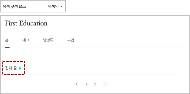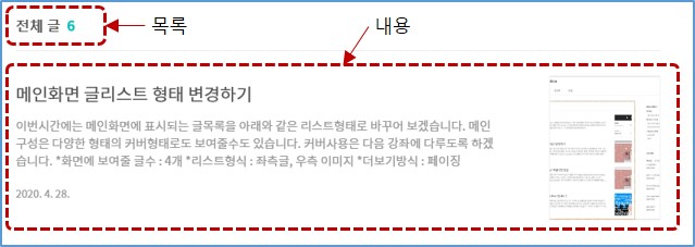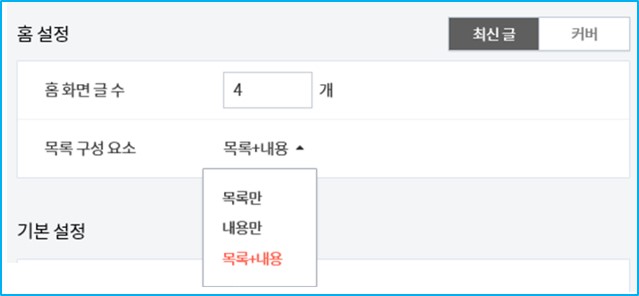 우측메뉴에 홈설정부분에서 홈 화면 글 수를 4로 입력하고, 목록 구성요소는 목록+내용을